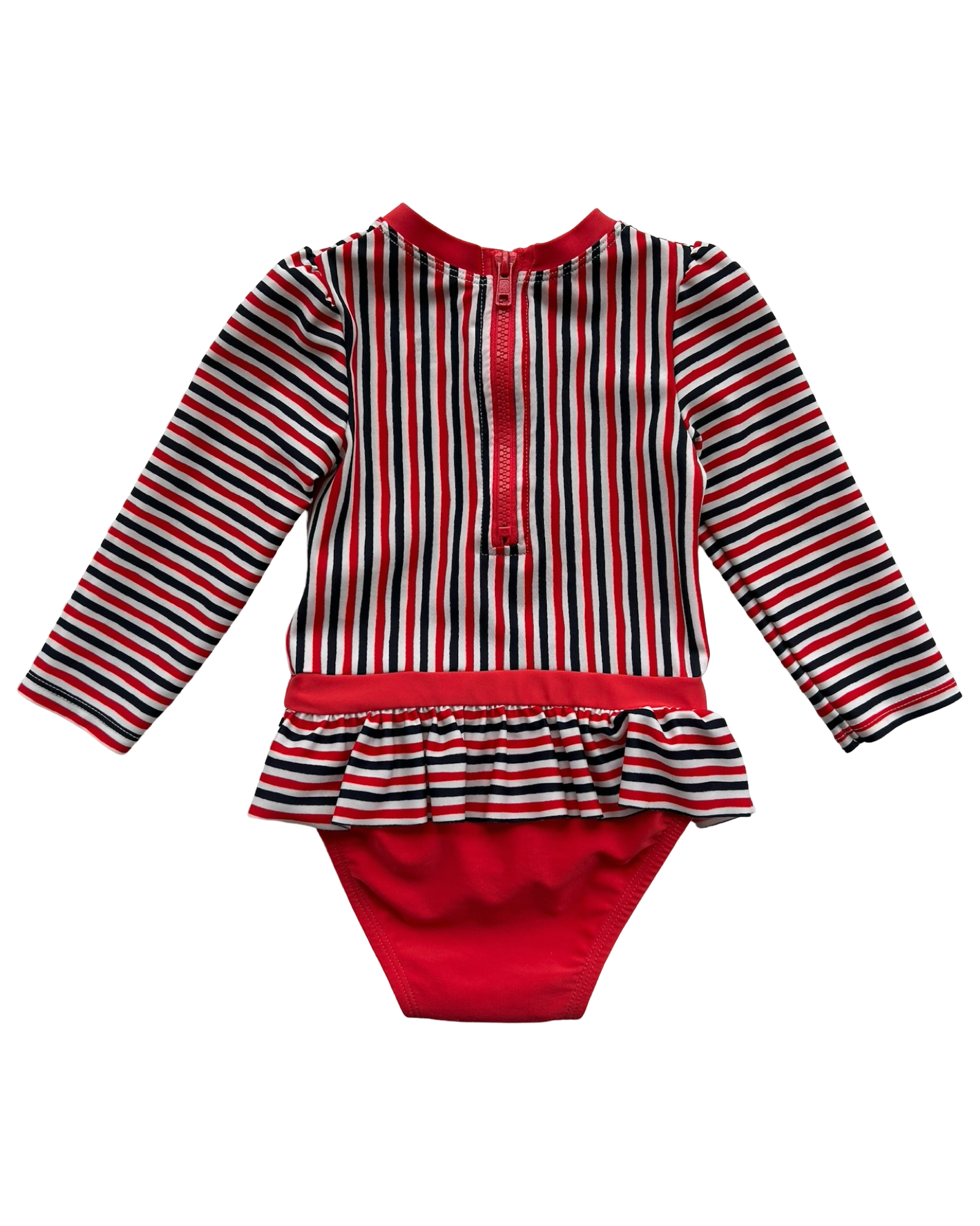 18M Baby Girls Cat & Jack Long Sleeve Ruffle Zip Snap Striped Swimsuit One Piece.