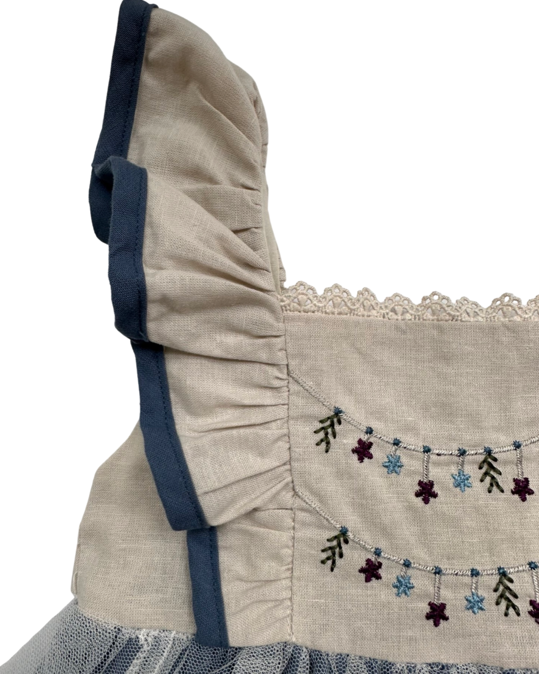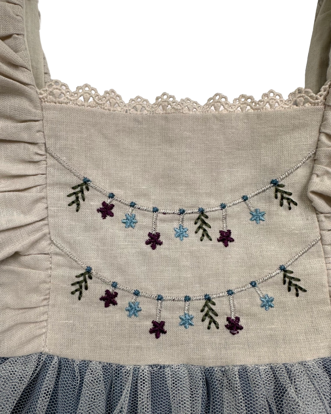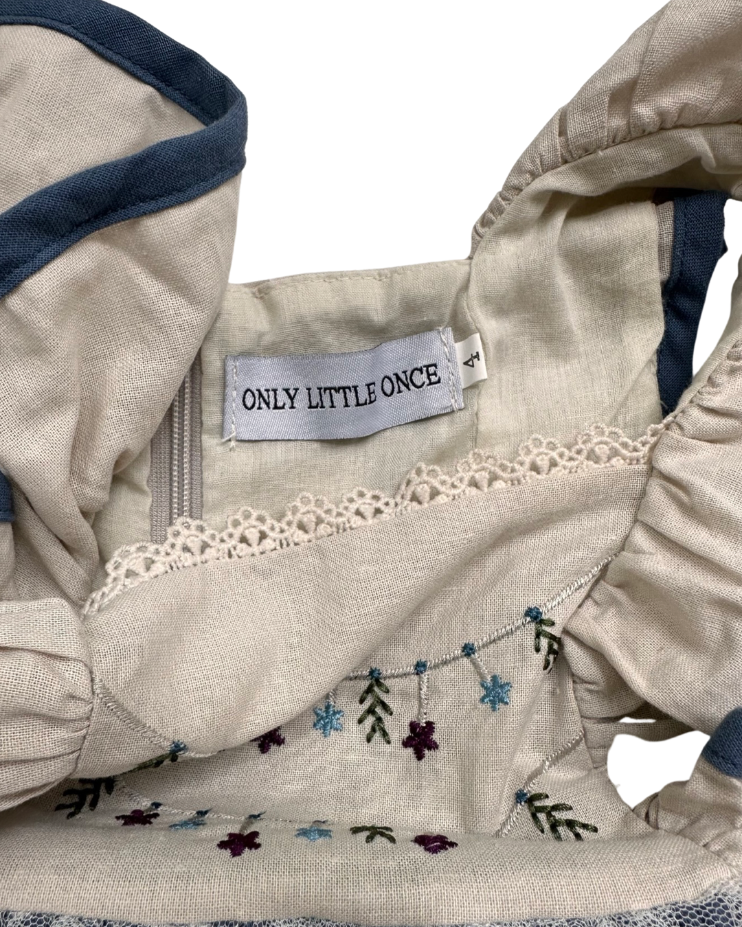 Excellent Used Condition- this is such a precious dress. Beautiful blue and cream dress with lace and tulle details, embroidered with greenery and stars on the top. Has the look of the Well Dressed Wolf Oh Holy Night Dress.