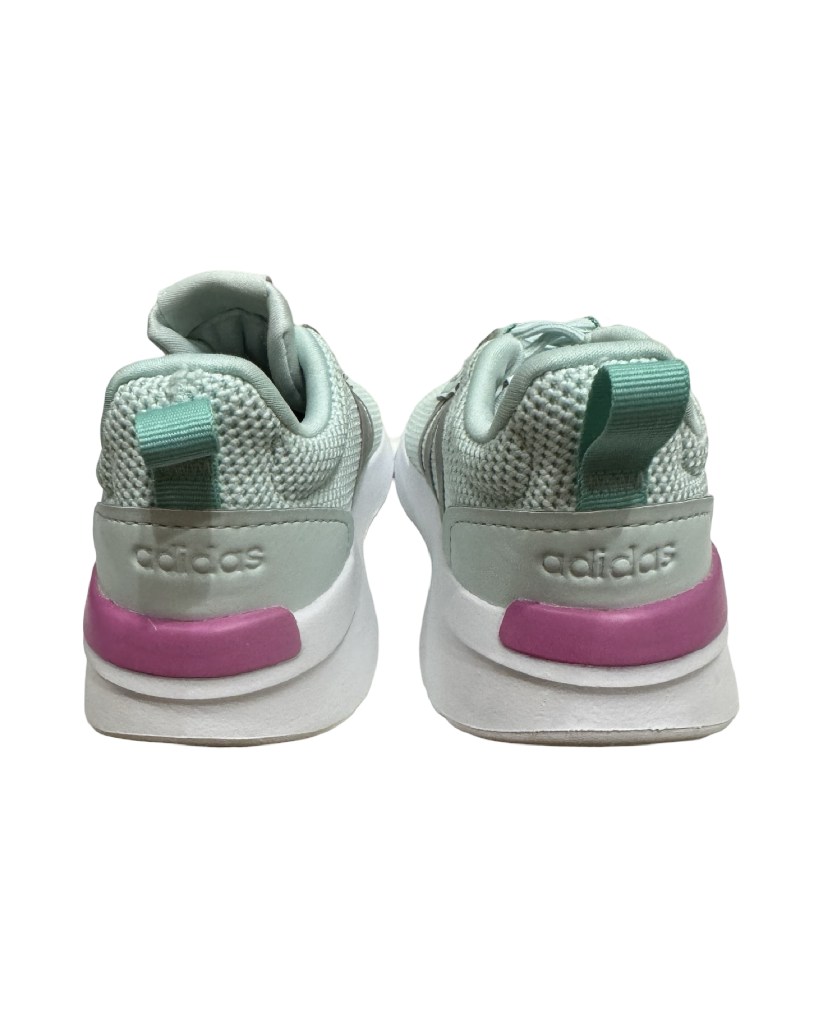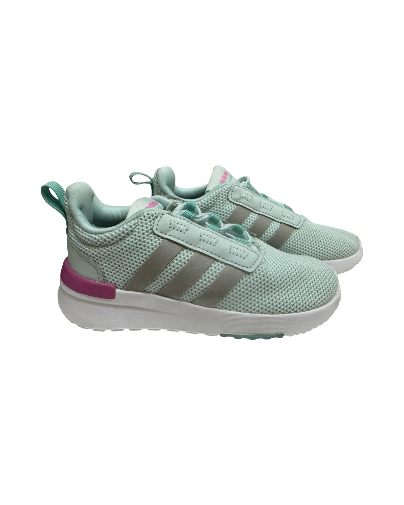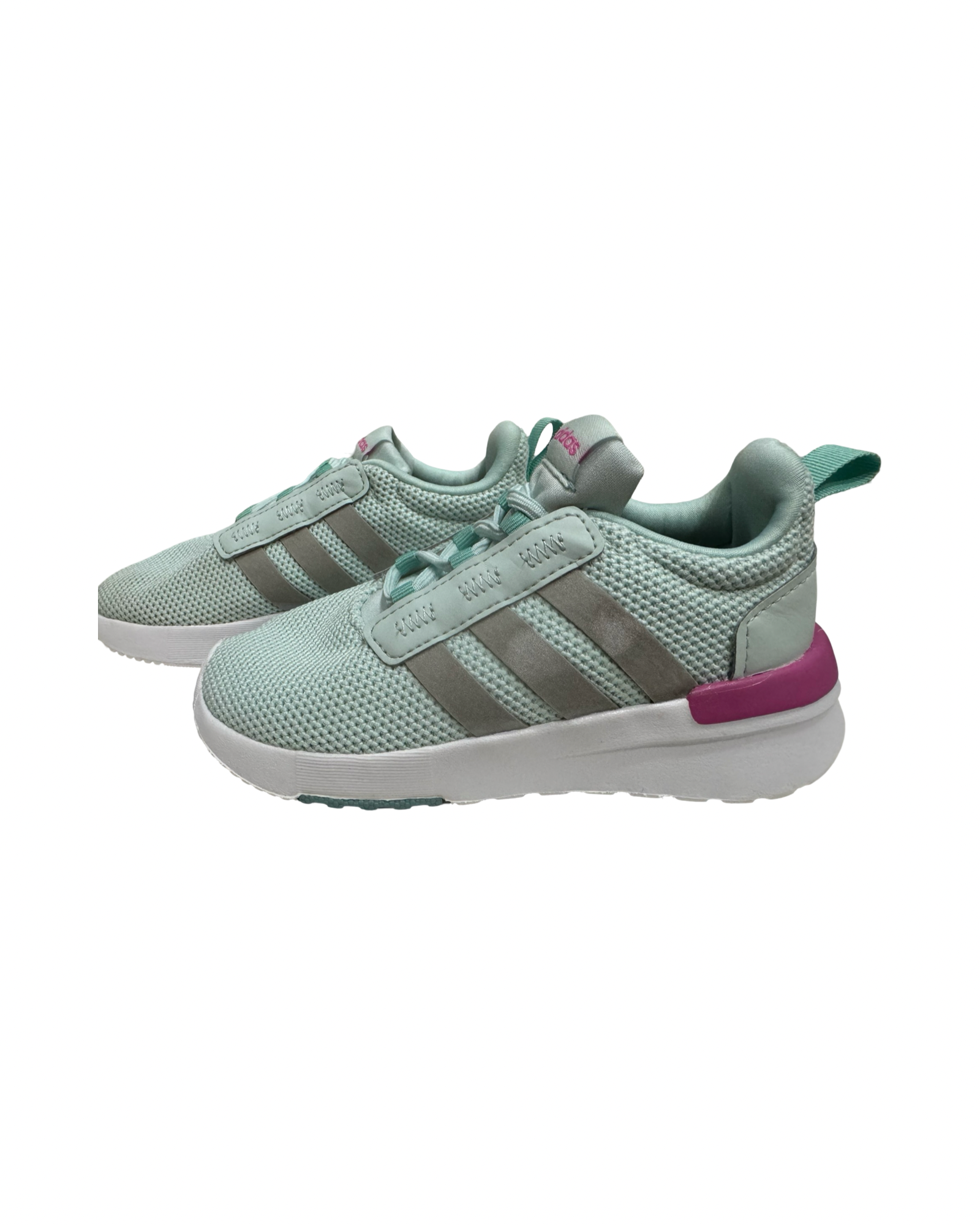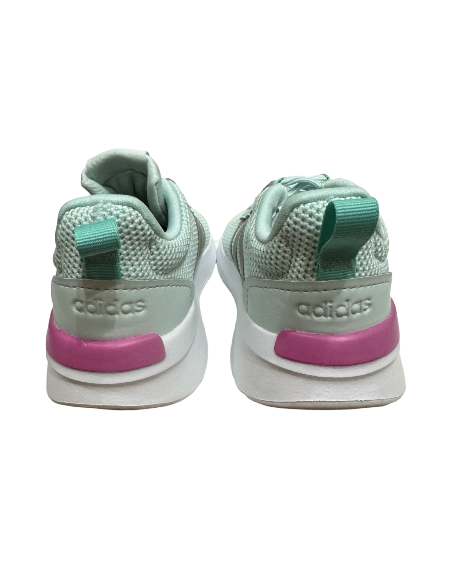 Adidas Racer sneakers in a 9K toddler in great condition. Bright aqua pull on sneakers with elastic laces. Bright pink accents. Adorable shoes.