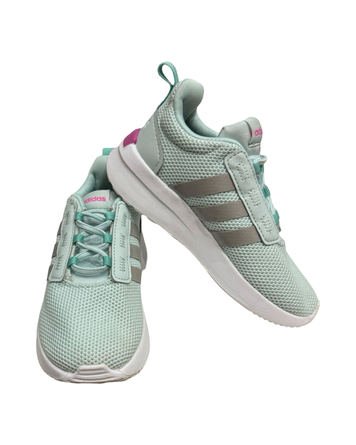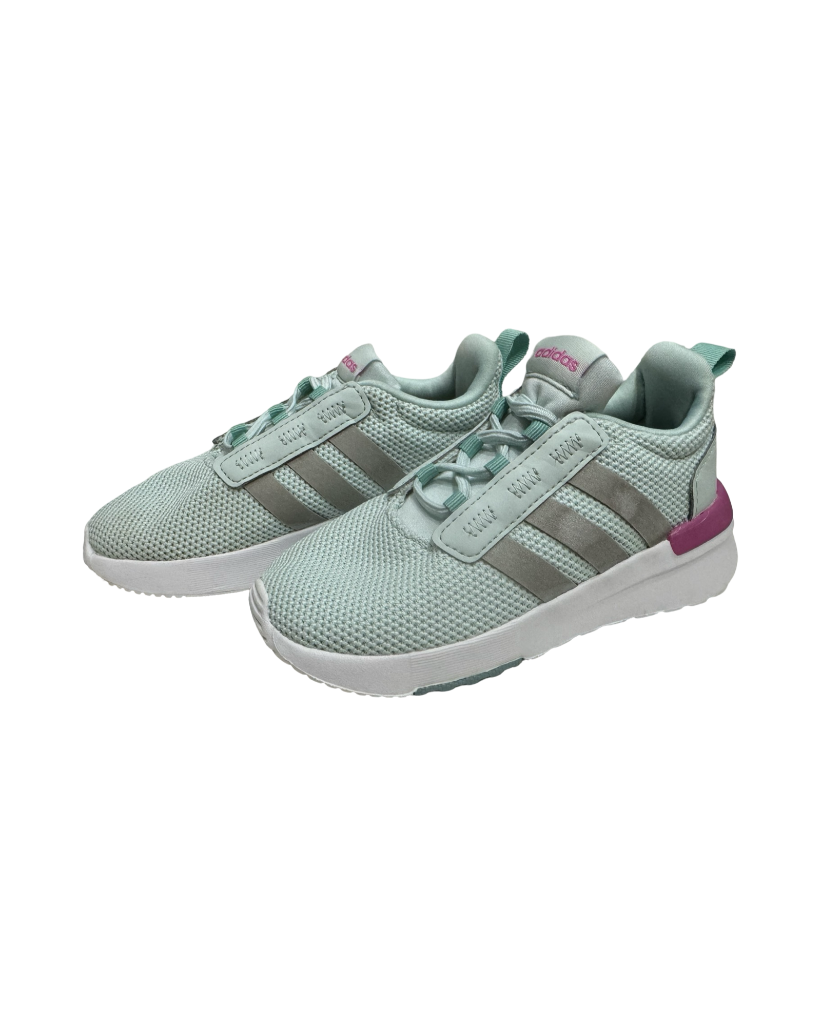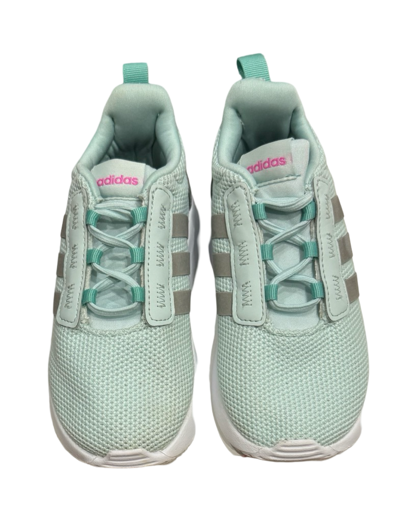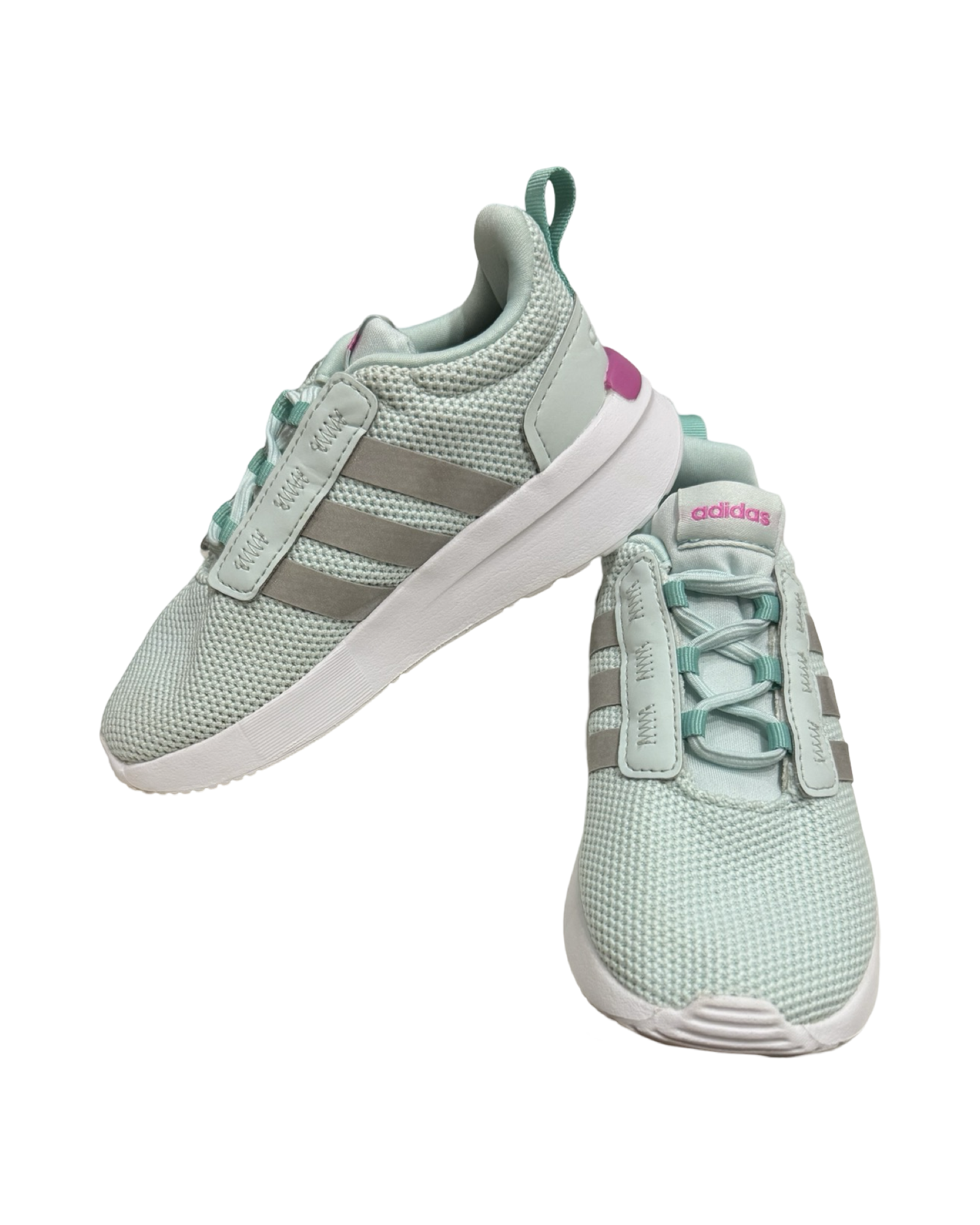 Adidas Racer sneakers in a 9K toddler in great condition. Bright aqua pull on sneakers with elastic laces. Bright pink accents. Adorable shoes.